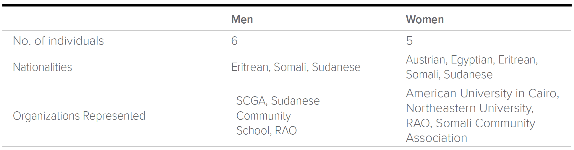 This case report is based on my work experience and the community meetings in Cairo, supplemented with a desk review of research on Cairo’s refugee communities, and additional unstructured interviews with key informants conducted eight months after I left RAO (see Table Below).